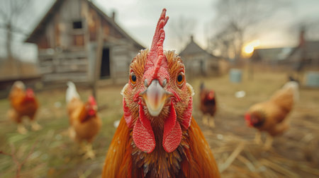 Agrarian scene: Chickens at the countryside farm showcase the reality of poultry and livestock.