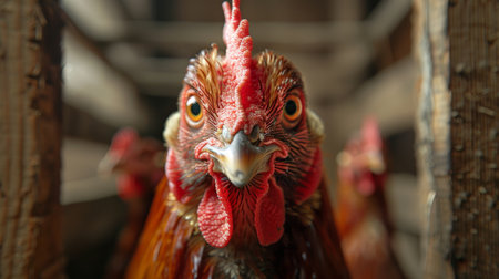 Close-up of a vibrant rooster with detailed feathers and intense gaze. That the image is generated using AI.