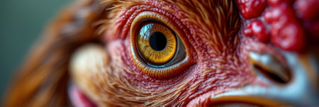 Close-up of chicken eye showcasing detailed feathers and texture. That the image is generated using AI.