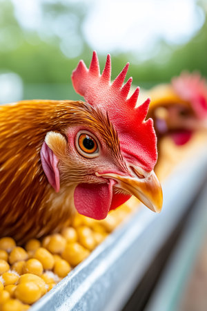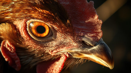 Close-up of chicken's eye and plumage in vivid detail. That the image is generated using AI.