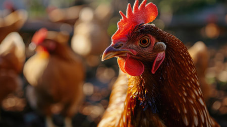 Portrait of a brown hen in front of other hens
