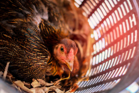 Close up Thai chicken in the bamboo nest. Asian style. Hens hatch in the nest. A hen hatching eggs in its nest.
