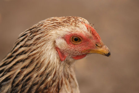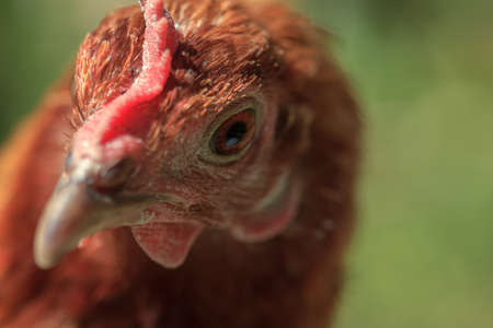 Farm living bird brown chicken looking around, head portrait