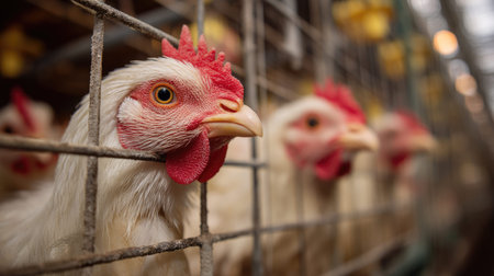 A close-up view of chickens in a cage on a farm, showcasing their feathers and distinct features. This image captures the essence of poultry farming and animal welfare.
