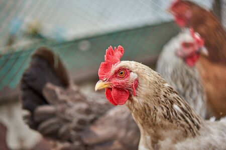 Close up of chickens in the coop. Hen in a farmyard - selective focus
