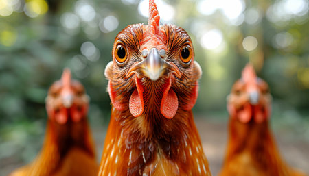Captivating close-up of three chickens showcasing their expressive features in a farmyard, highlighting the beauty of domestic birds and rural life.
