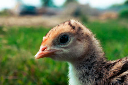 Little turkey on green grass. Turkey-poult close up. Turkey chick walking in the air. Eco farm.