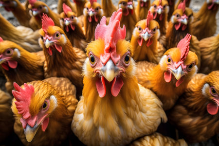 a lot of chickens waiting to be fed up, they are looking at the viewer. Neural network generated in May 2023. Not based on any actual scene or pattern.