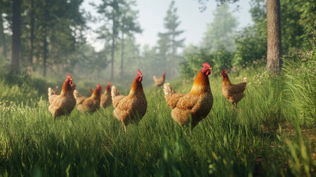 Flock of chickens roaming in lush green park on a sunny day. That the image is generated using AI.