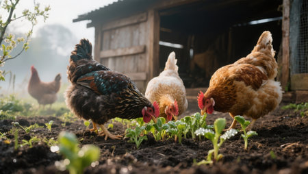 A charming close-up of brown chickens wandering the farmyard, surrounded by a soft fog, showcasing their natural behavior in a rustic setting.