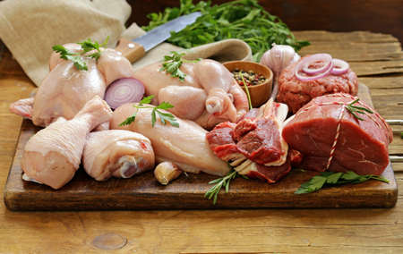 raw meat assortment - beef, lamb, chicken on a wooden board