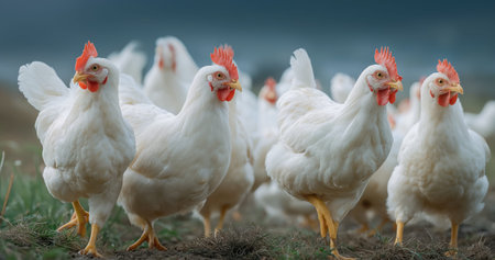 Group of white chickens walks on green grass free range poultry farm scene perfect for agriculture food production animal welfare or organic farming topics