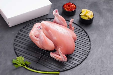 Fresh raw whole chicken without skin placed on grill arranged with parsely leaf and small bowls of chilly flakes and lemon slices with delivery box on grey textured background