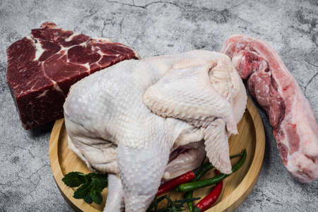 An eye catching illustration of Raw meat assortment, beef, chicken, turkey. Created using Generative AI tools.