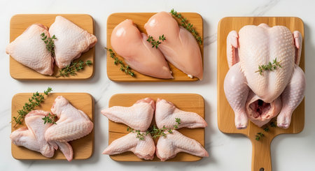 Various raw chicken parts, including a whole chicken, breasts, thighs, and wings, arranged on wooden cutting boards with fresh thyme, ready for cooking.