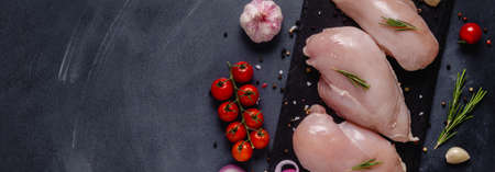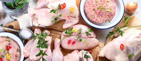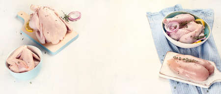 Different types of fresh chicken meat. Top view, flat lay, panorama, banner