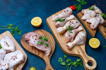 Raw chicken meat fillet, thigh, wings and legs with herbs ,spices,lemon and garlic on dark blue background. Top view