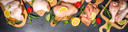 Various raw chicken meat portions. Set of uncooked chicken fillet, thigh, wings, strips and legs on black cooking table background with spices