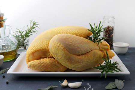 Raw duck breast leg feet wing duck head with spices herb rosemary to cook on white plate, Fresh duck meat for food , poultry meat parts