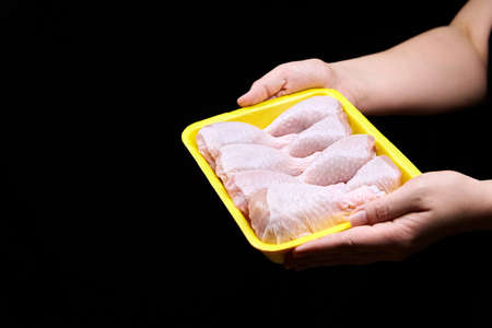 Chicken shin in yellow tray on black background with copy space. Woman holds box with fresh chicken legs. Female hands, raw poultry meat