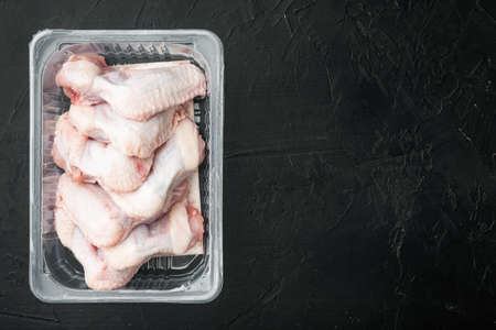 Fresh chicken wings package set, on black stone background, top view flat lay, with copy space for text