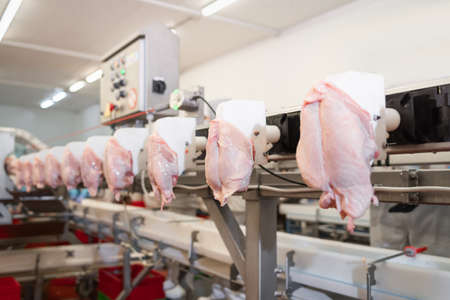 Raw meat cuts on a industrial conveyor belt.Meat processing in food industry.Conveyor Belt Food.Automated production line in modern food factory.
