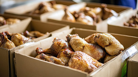 A close-up view of freshly processed chicken legs neatly packed in cardboard boxes, ideal for food distribution and market supply.