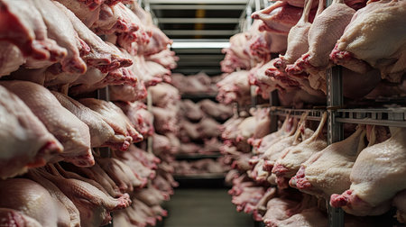 A glimpse into a meat warehouse featuring fresh chicken stored in a chilled environment. The orderly arrangement ensures quality, freshness, and hygiene essential for food safety.