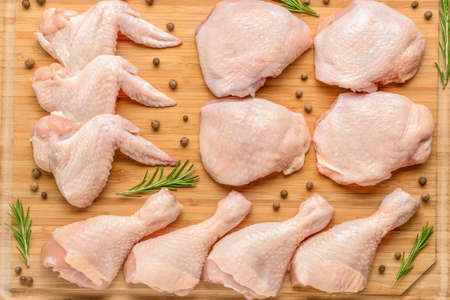 Various raw chicken meat portions. Set of uncooked chicken fillet, thigh, wings, strips and legs on white cooking table background with spices