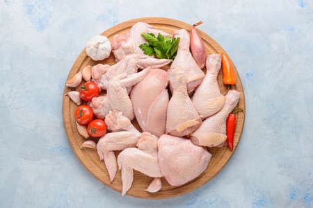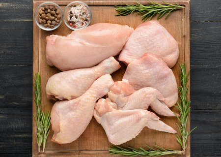Assortment of raw chicken breast (fillet), wings and legs with spices and herbs. Cooking background