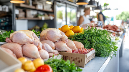 Fresh whole chickens and herbs displayed at an outdoor market. Concept of organic food, culinary ingredients, farmers market, gastronomy.