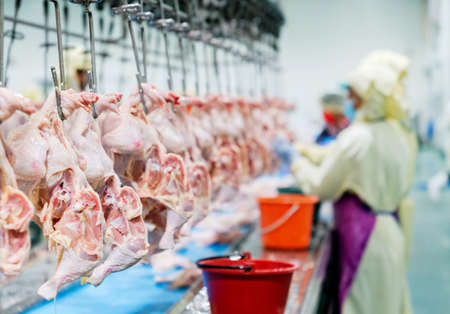Chicken thighs are cut on a rail before being trimmed in factory.