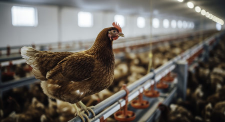 Brown hen perched on a metal bar in a large, clean industrial poultry farm. many chickens are visible in the background, representing modern agriculture and food production.