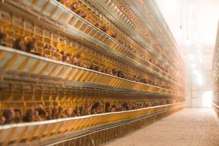 Factory Chicken egg production. Red chickens are seated in special cages. Linear perspective. Agribusiness company.