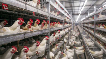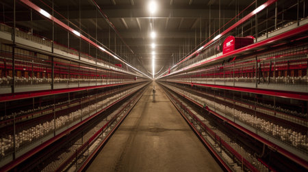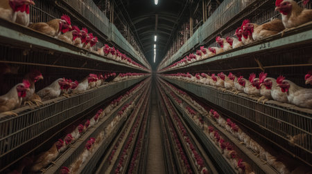 Rows of hens are housed in a large, illuminated commercial poultry farm, a key part of the modern agricultural system for mass egg production. This image captures the scale and efficiency of the food supply chain industry.