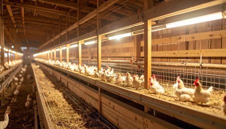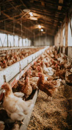 Numerous chickens are gathered in a coop, with rows of them visible along feeding troughs. The image features a warm color palette with shades of brown and yellow. The wooden structure and the overhead lighting suggest an indoor environment, potentially for agricultural purposes. This image could be used for illustrating topics related to farming or food production.