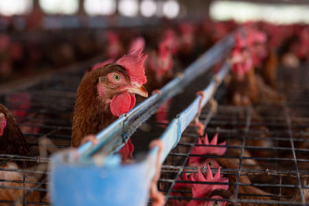 Chicken in the factory, Hens in cages industrial farm in Thailand, Animal and agribusiness, Food production and industry concept