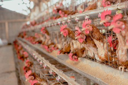 Rows of laying hens eating in a chicken farm, industrial poultry farming concept