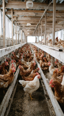 Numerous chickens are gathered within a long wooden structure. The image features a symmetrical composition with rows of birds. Warm tones dominate, enhanced by overhead lighting. The scene suggests an indoor environment. Suitable for a variety of commercial and illustrative purposes.