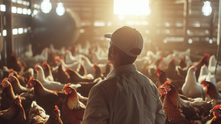 Warm morning light streams into a spacious, modern henhouse, illuminating rows of free-range chickens as they begin their day. This image captures the heart of sustainable poultry farming, highlighting a commitment to ethical animal husbandry and the start of the food supply chain in a clean, orderly environment.