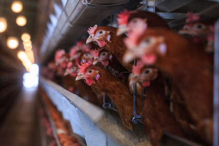Close-up of laying hens in the coop, selective focus. Poultry farm
