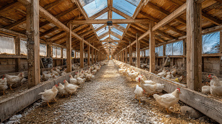 A well-lit chicken coop showcasing healthy birds roaming freely. The rustic wooden structure and straw bedding create a vibrant and productive environment for poultry farming.