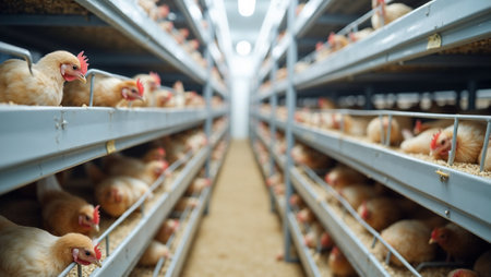 Interior of a large poultry farm, with chickens housed in long rows of cages and automated egg collection systems