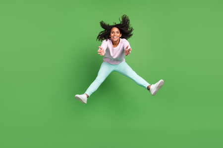 Full body photo of dreamy happy young girl jump up look empty space fly hair isolated on green color background