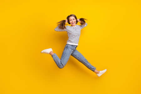 Full size photo of funny funky millennial girl jump enjoy holidays moving wear modern outfit denim jeans white sneakers isolated over bright color background