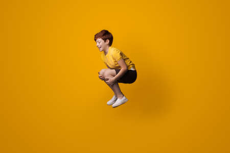 Small caucasian boy with red hair smiling and jumping on a yellow studio wall