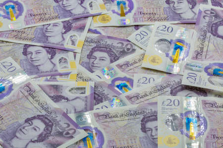 Multiple 20 banknotes of the United Kingdom spread out as textured money background, representing finance, business, and economic growth.