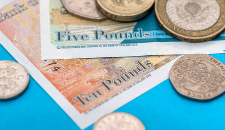 LONDON, UK - CIRCA MAY 2020: Pound banknotes and coins money (GBP), currency of United Kingdom