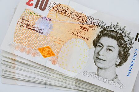 UK pounds banknotes background. Money of United Kingdom. 10 pounds