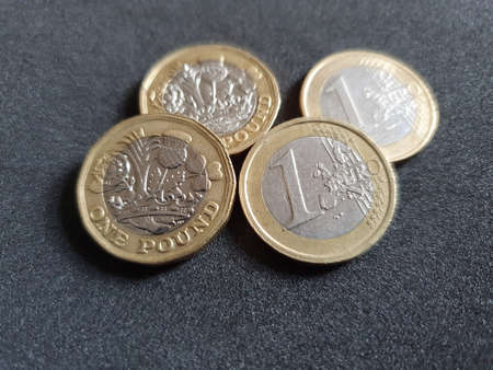 coins of one sterling pound and one euro on the table